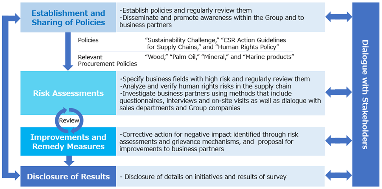 The Sojitz Group promotes its initiatives in accordance with the UN Guiding Principles on Business and Human Rights while referencing the International Bill of Human Rights and the OECD Guidelines for Multinational Enterprises. In implementing these measures, we engage in dialogue with stakeholders and follow a process that includes the establishment and sharing of policies, risk assessments, improvements and remedy measures, and disclosure of results. The content of each process is reviewed and improved on a regular basis, taking into account factors such as external trends and the internal environment. In addition, we promptly take corrective action if areas for improvement are identified through risk assessment or grievance mechanisms.