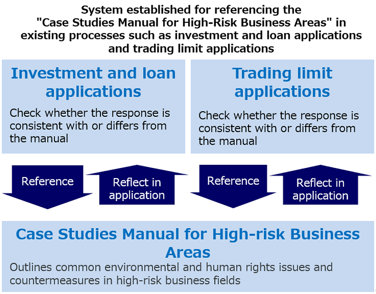 When conducting new investments and loans, the applying department identifies potential risks such as forced labor, child labor, and impacts on indigenous peoples based on human rights risk issues and response points in each business area, and formulates countermeasures. When necessary, due diligence is conducted to ensure no omissions in the identification of human rights risks or the formulation of countermeasures.