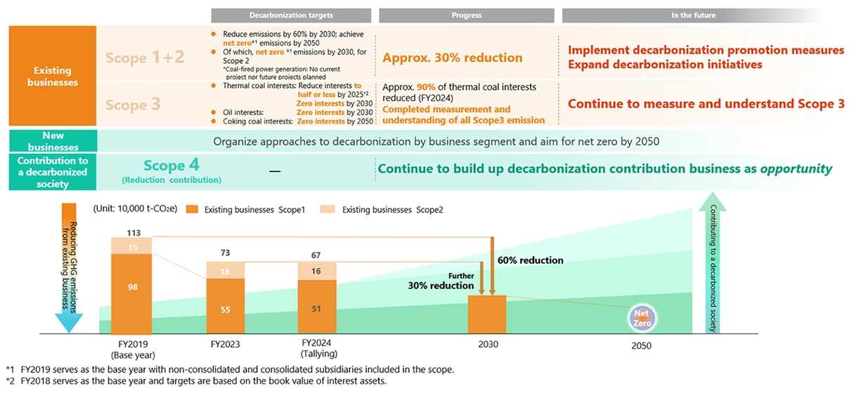 In addition, for businesses in operation as of FY2024, Sojitz aims to reduce total GHG emissions by 40% by FY2035 compared with FY2024 levels, including achieving net impact zero* for Scope 2. For businesses thereafter, Sojitz aims to achieve net zero by 2050.