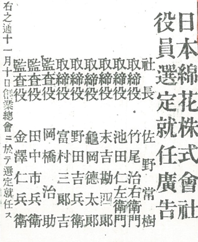 【日本綿花】大阪朝日新聞・役員選定就任広告(1892年11月16日)