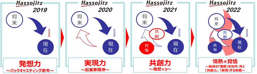 Hassojitz プロジェクトは2019年度より、バックキャスティングによる未来思考や戦略的思考、挑戦する文化を育む事を目的に、全社横断で始まった新規事業構想プロジェクトです。