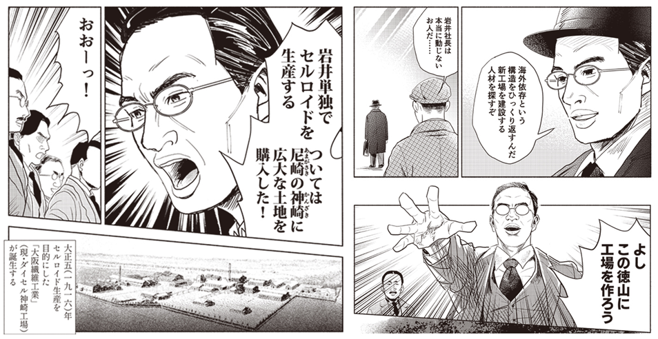 時同じくして岩井商店の岩井勝次郎も、大戦が勃発し、兵庫県網干のセルロイド工場が軍事転用されると、セルロイドの将来性に期待し、岩井商店単独で新たなセルロイド工場を設立することを決意。尼崎の神崎に大阪繊維工業(現・ダイセル神崎工場)を設立した。また大戦による欧州から亜鉛鉄板の輸入が滞ると、山口県の徳山に新たな工場(後・日新製鋼、現・日本製鉄)を設立するなど、輸入品の国産化を推し進める。