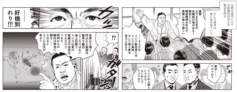 世界一周視察を終えた日本綿花の喜多又蔵は、綿糸だけでなく綿布の輸出を拡大するよう指示。喜多は荷役が集中していた神戸港の負担を軽減するため、綿花の大阪への直輸入を開始し、また世界各国の事情を知る若手として、紡績業界で一目を置かれる存在となっていた。大戦勃発により、一時的な市況の暴落、紡績業界の操業短縮にも動じず、逆に欧州からの製品輸出は細り、日本に大量の注文が入ると予想し、見事に的中させ、日本の紡績業界の飛躍のきっかけを掴む。