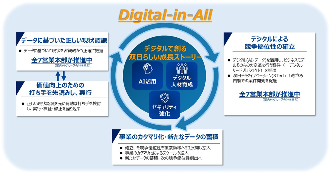 双日は、今後も、多様な事業基盤にデジタル・AIの力を掛け合わせることで、既存ビジネスの価値向上や新たなデジタルビジネスの価値創出などを推進し、企業価値向上に努めていきます。
