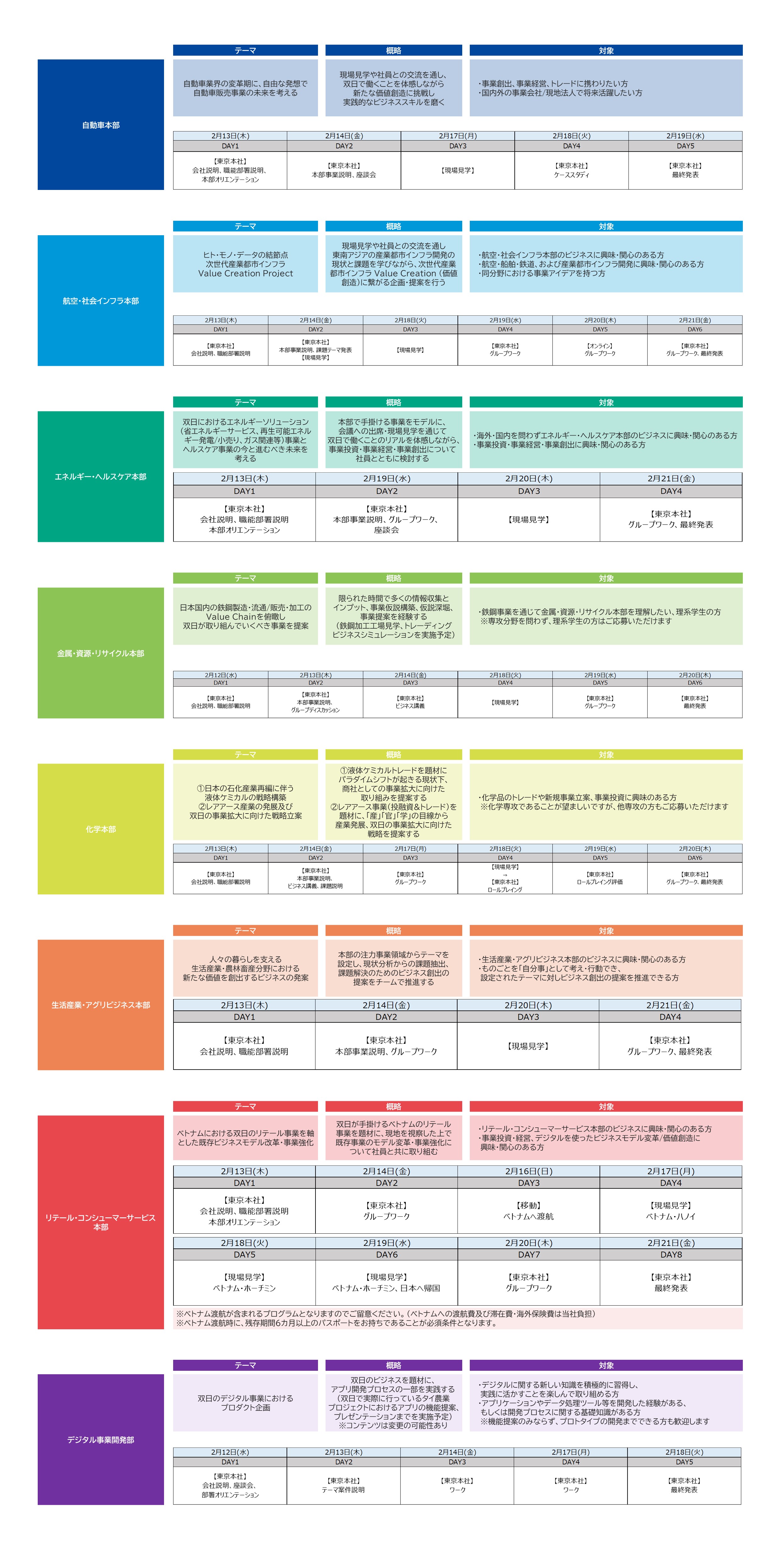 | 開催日程/本部 | 【3月開催】 開催日程:2026年3月16日(月)~19日(木) 開催本部 ※参加可能となるプログラムは1部署のみ - 航空・社会インフラ本部 - 金属・資源・リサイクル本部 - 化学本部 - 生活産業・アグリビジネス本部 【4月開催】 開催日程:2026年4月14日(火)~17日(金) 開催本部 ※参加可能となるプログラムは1部署のみ - 自動車本部 - エネルギー・ヘルスケア本部 - リテール・コンシューマーサービス本部 ※デジタル推進本部では、別途3月に2~4週間程度のプログラムを実施予定です。全本部の詳細と合わせ、12月中に公開予定です。 |