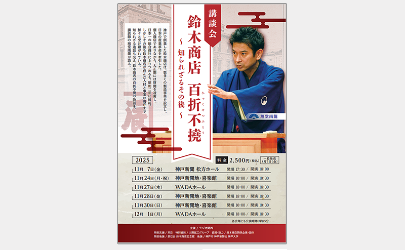 当社は2023年に鈴木商店を題材とした舞台「彼の男 十字路に身を置かんとす」を特別支援し、神戸市と共同事業を実施しました。また2025年にも神戸にて開催された講談鑑賞会「鈴木商店 百折不撓~知られざるその後」(講談師:旭堂南龍)を特別支援し、両イベントともに招待事業「鈴木よねさんからの贈り物」として、教育関係者、港湾関係者、観光ボランティアを舞台に招待しました。