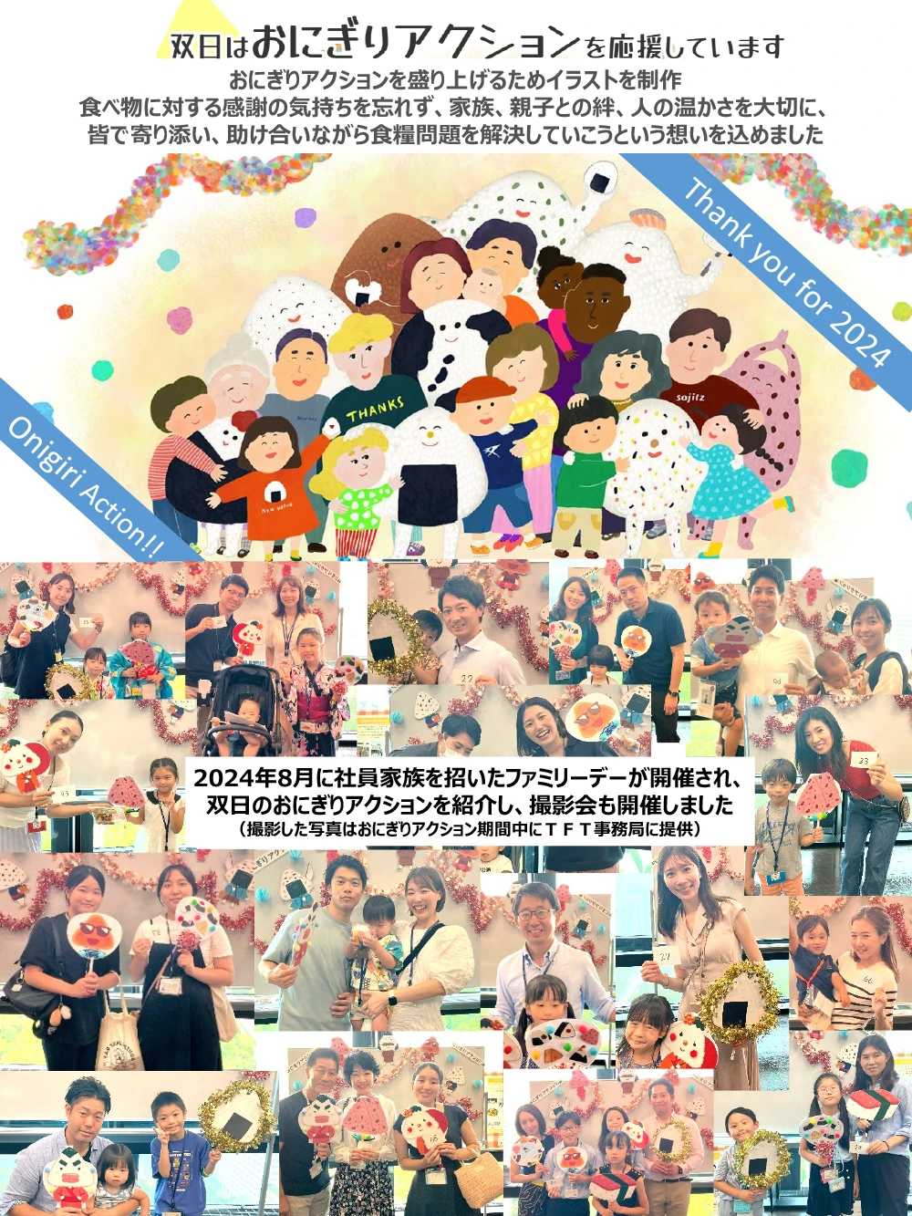 2024年、双日は発足20周年を記念して8月22日に東京本社でファミリーデーを開催。600名以上の親子が参加しました。会場では双日のこれまでのおにぎりアクションの取り組みを紹介し、アフリカ・アジアの子どもたちに給食として届けるべくおにぎりグッズを使って「おにぎり撮影会」を開催。また、双日の食ビジネスと社会貢献活動について学べる双日おにぎり弁当を参加者に振舞いました。