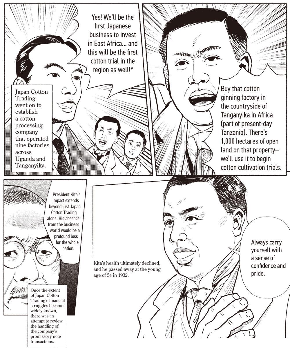 Upon his return from the Paris Peace Conference, Kita’s reputation in the business community grows overnight. He leads the establishment of the Hanwa Railway (today’s JR Hanwa Line) and orders Japan Cotton Trading’s expansion into East Africa. In light of several economic downturns including the Showa Financial Crisis brought on in part by the bankruptcy of Suzuki & Co. and the looming Great Depression, Japan Cotton Trading incurs massive losses and embarks on a plan to reduce its capital.